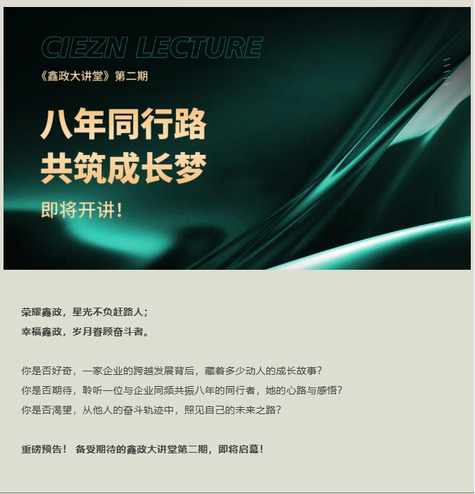 鑫政大講堂,不僅是一個傳遞知識的平臺,更是一個凝聚文化、共享成長、啟迪未來的舞臺。我們堅信,企業的偉大源于每個個體的成長,企業的榮耀歸于每個奮斗者的幸福。本期講堂,我們將通過個人成長洞見公司波瀾壯闊的發展歷程;通過每一位普通員工的真情流露,感受鑫政大家庭的溫暖底色,詮釋“榮耀鑫政、幸福鑫政” 的深層內涵。